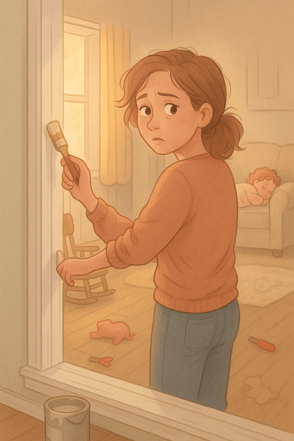 I’m painting trim. Preventing toddler tantrums with snacks and snuggles.