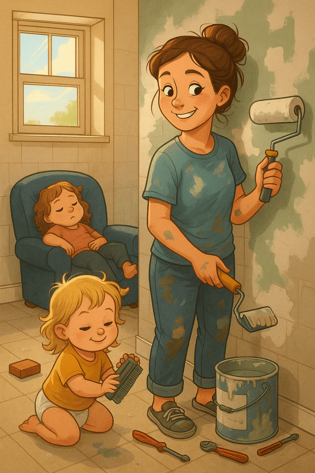 Meanwhile, I put on my DIY cape and tackled the bathroom again — sanding, painting, and almost finishing the whole thing.